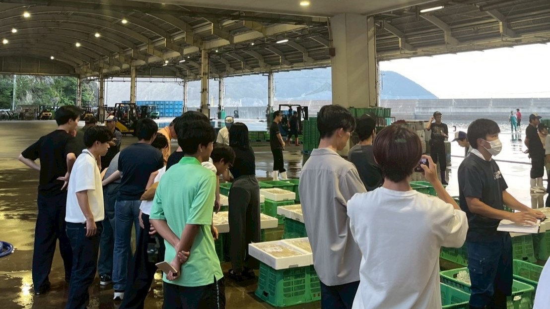 早朝6時00分から、愛南漁協朝市を見学しました。魚の水揚げやせりの様子を見学し、漁協の方たちと直接話をすることもできてとても良い経験になりました。