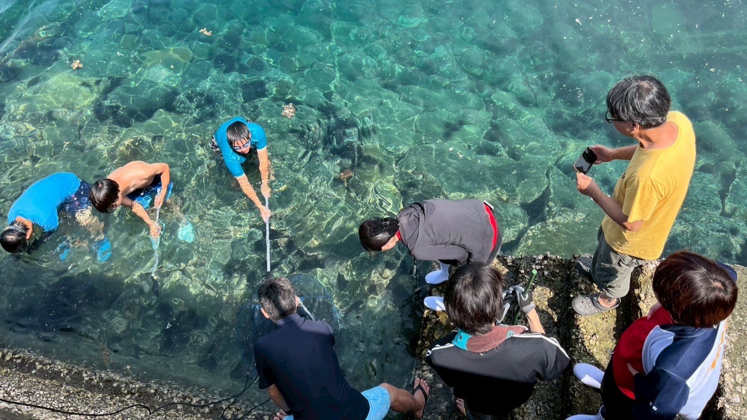 また、ガンガゼウニの駆除体験では、ガンガゼウニの生態や自然に与える影響などについて愛媛大学南予水産研究センターの方から学んだうえで、実際に海に入り、火ばさみ等を活用しながら1,000匹ほどのガンガゼウニを捕獲しました。その後は捕獲したガンガゼウニを種類別に仕分けたほか、愛媛大学の学生と意見交換を行いました。意見交換を通じて普段は聞けないであろう貴重な話を聞くことが出来たほか、愛南町の水産分野を取り巻く課題を解決するための策について若者目線から考えることの重要性を学びました。