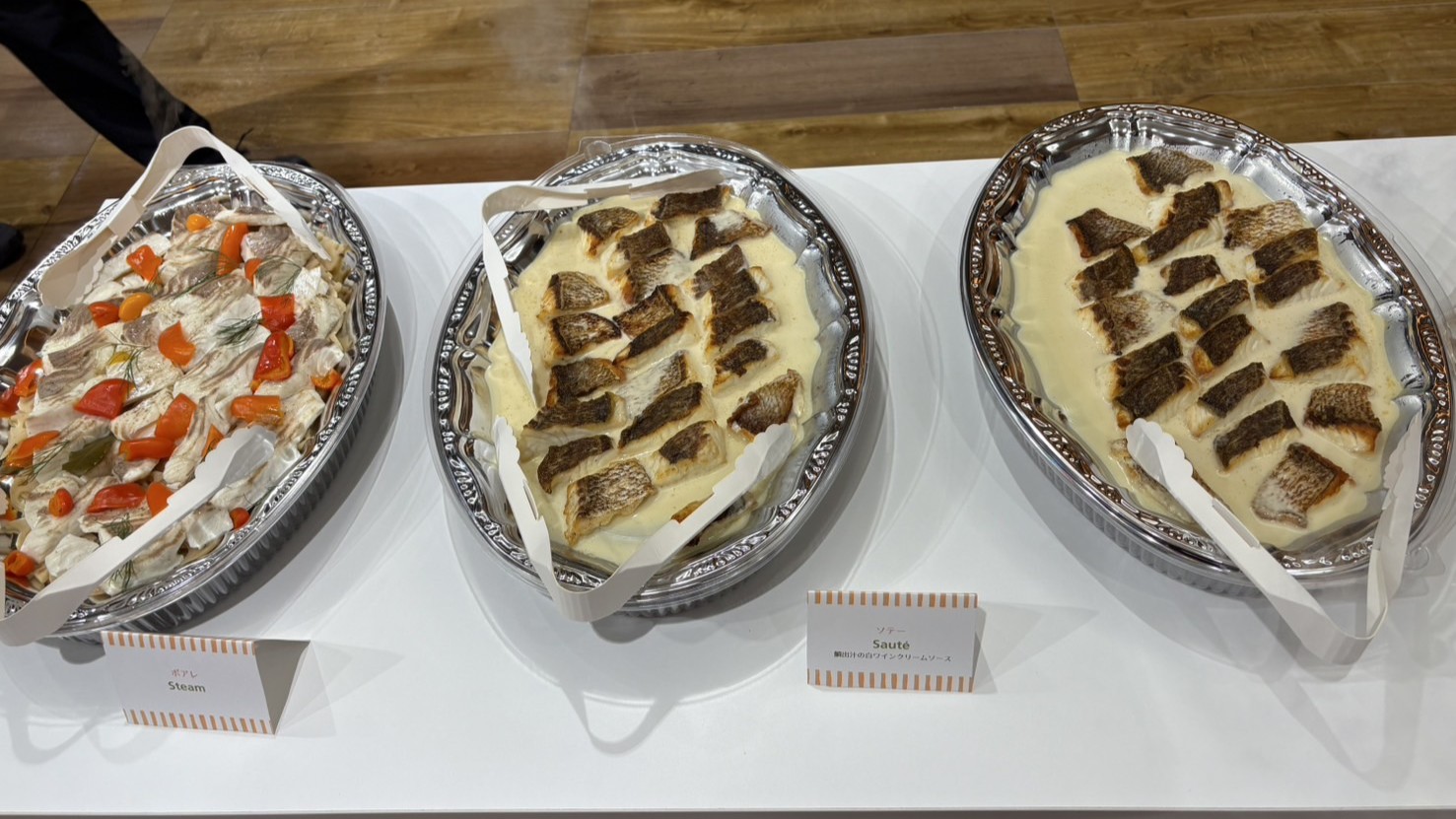 まず、刺身は愛南町でも愛される「フジマルツ醤油の刺身醤油」と共に食べていただき、真鯛の甘さと醤油のマッチングを楽しんでいただきました。「刺身醤油が甘くて真鯛に合う!」と大人気でした。また、カルパッチョには梨とセロリのピクルスやフルーツパプリカピクルスを合わせ、野菜と共にさっぱりと楽しんでいただきました。