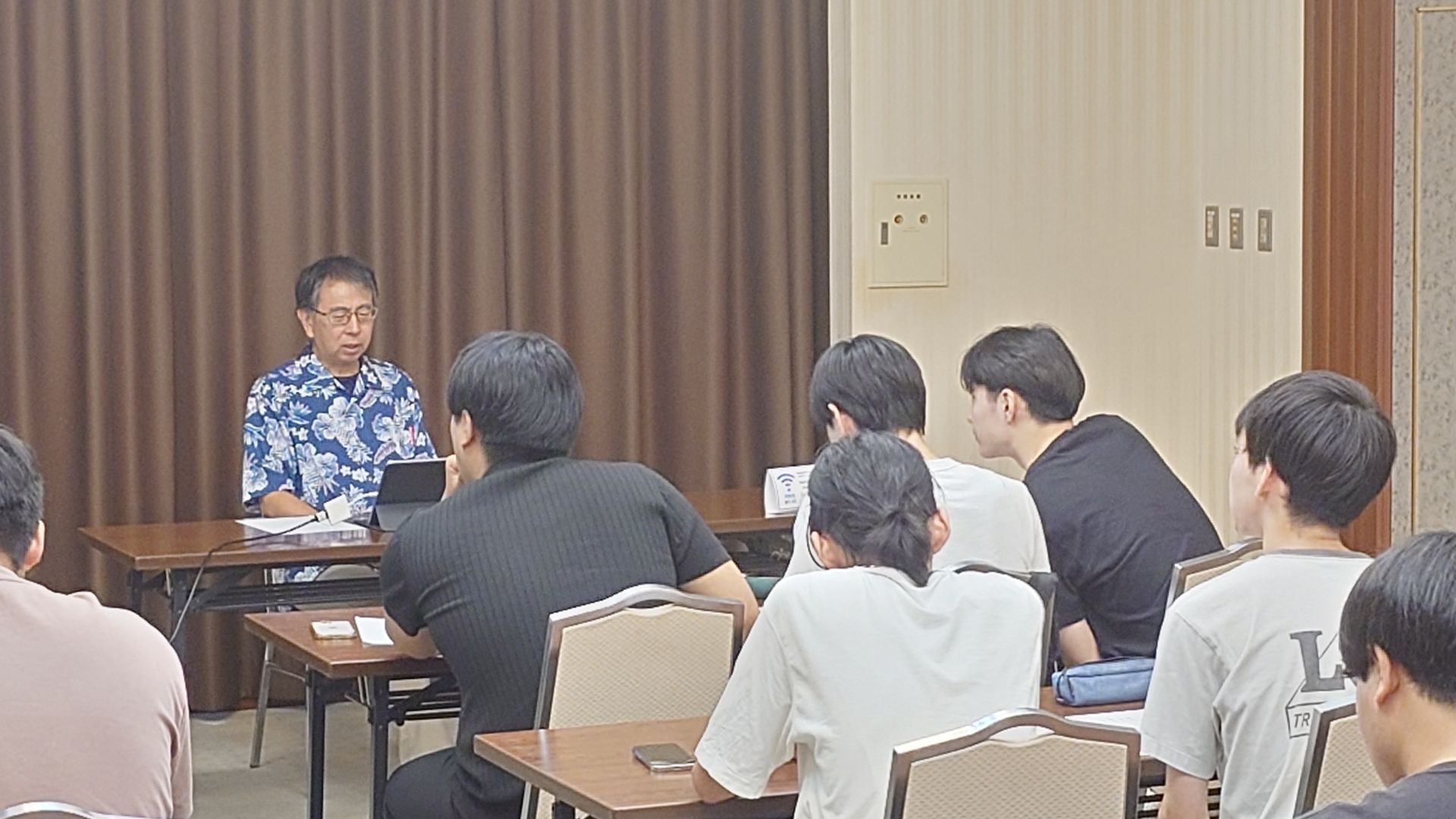 21名の参加者が集まり、学びと交流を深める充実した一日となりました。 午前中は、松本先生による「ゲーム理論」に関する講義とグループワークを行いました。講義では、相手の立場や状況を考慮したうえで最善の選択を導くというゲーム理論の考え方について学び、実際にグループで問題を解きながら理解を深めました。リーダーを支える周囲の役割やチーム全体で協力することの大切さを学び、今後のチーム活動に活かせる有意義な時間となりました。