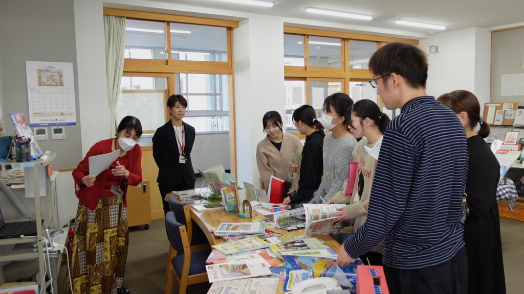 司書教諭課程科目「情報メディアの活用」の受講生が松山市立東中学校の学校図書館を見学